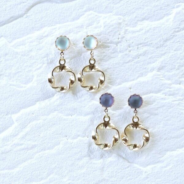 銅製高品質(ニッケルフリー鍍金)×ムーンストーン調ガラスのピアスです。