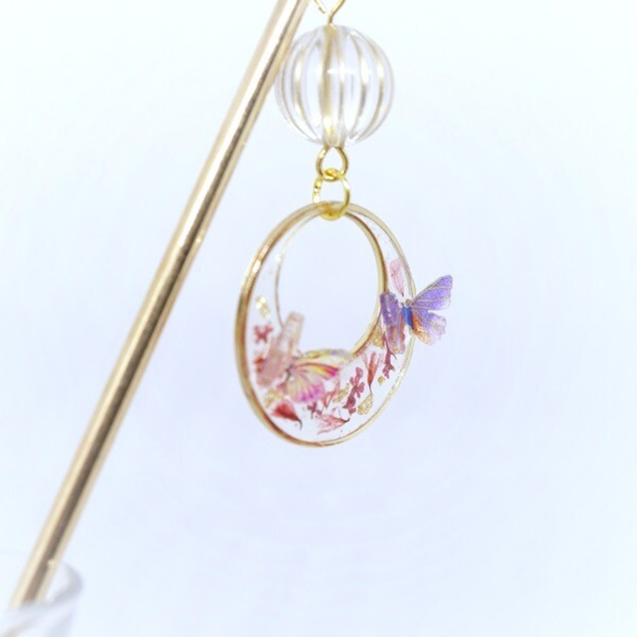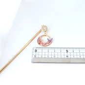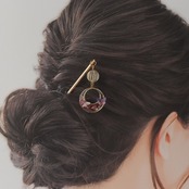 シンプルなスティックかんざしのチャームにクラシカルなクリアビーズと三日月のようなサークルパーツ。