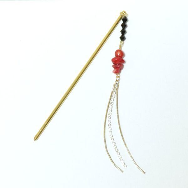 赤珊瑚の大粒さざれとチェーンチャームが揺れるシンプルなスティックかんざし