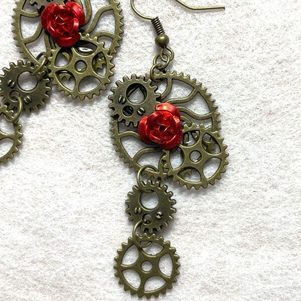 スチームパンク風の歯車と赤いバラのピアス。