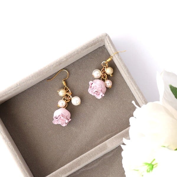 柔らかな素材のバラとパールビーズ揺れる上品な可愛さのピアス。