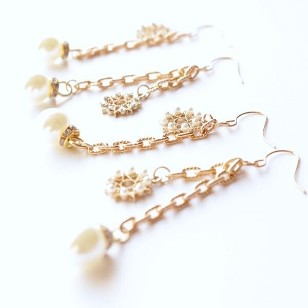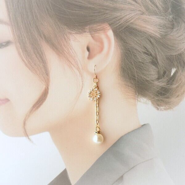 存在感のあるカットチェーンに雪の結晶のようなチャームと、大玉のパール調ビーズが揺れるアシンメトリーデザインのピアスです。