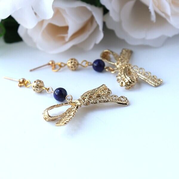 天然石ピアス リボンモチーフ ラピス ゴールドレースリボン 大きめイヤリング