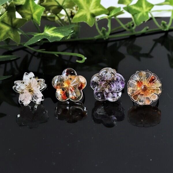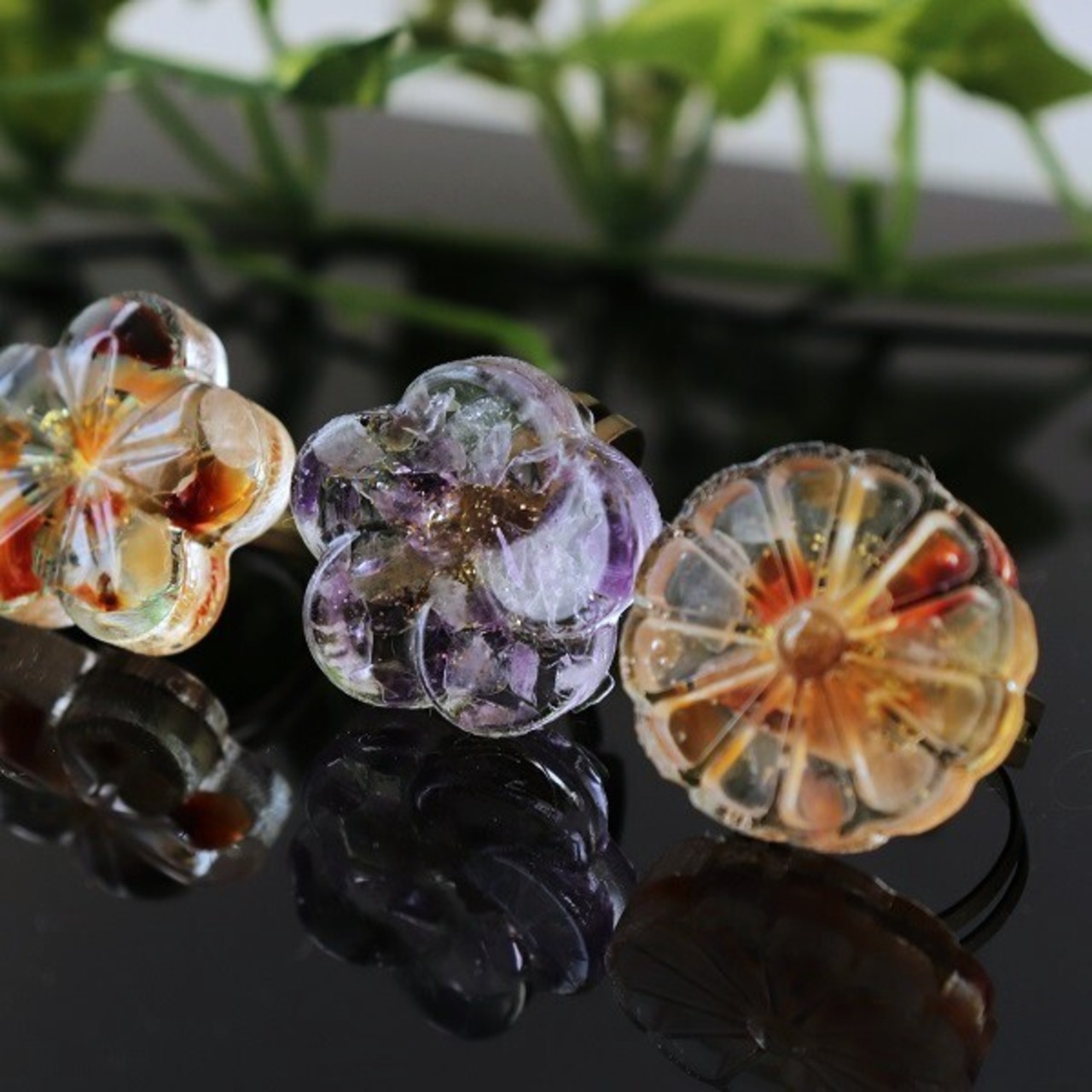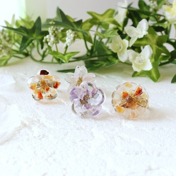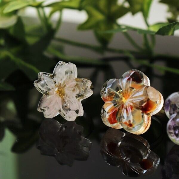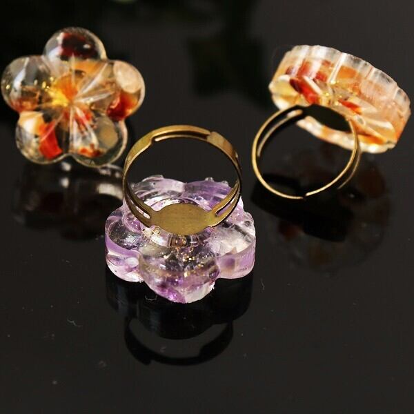 大きめの花の中に天然石のさざれ石を詰め込んだ和柄リング。