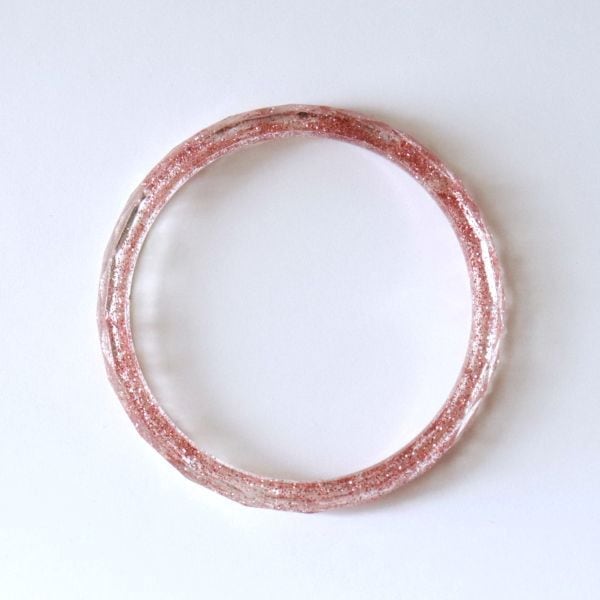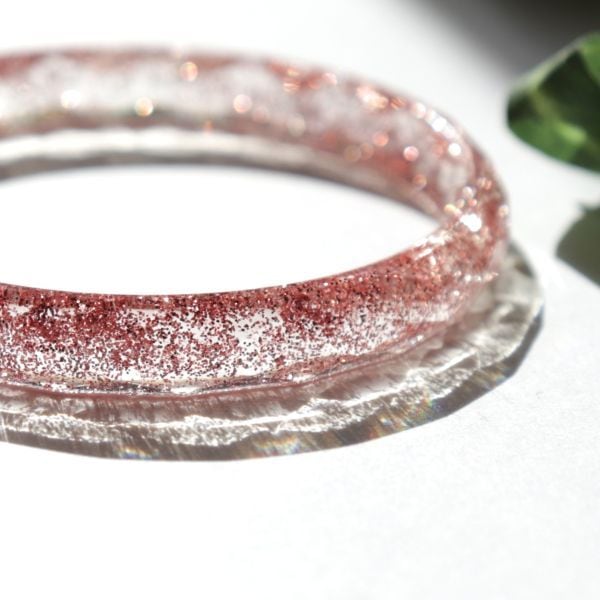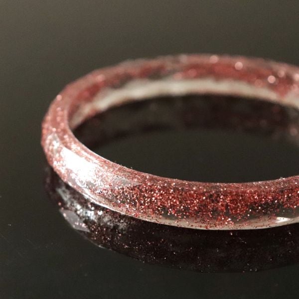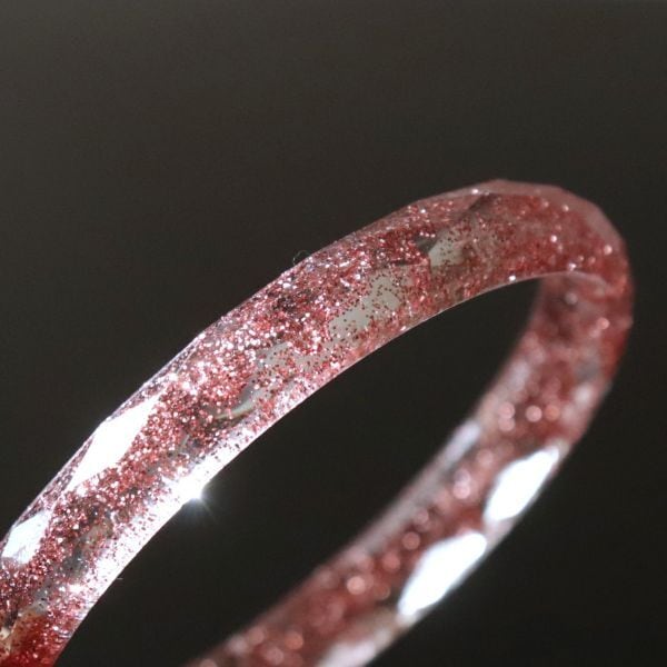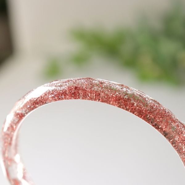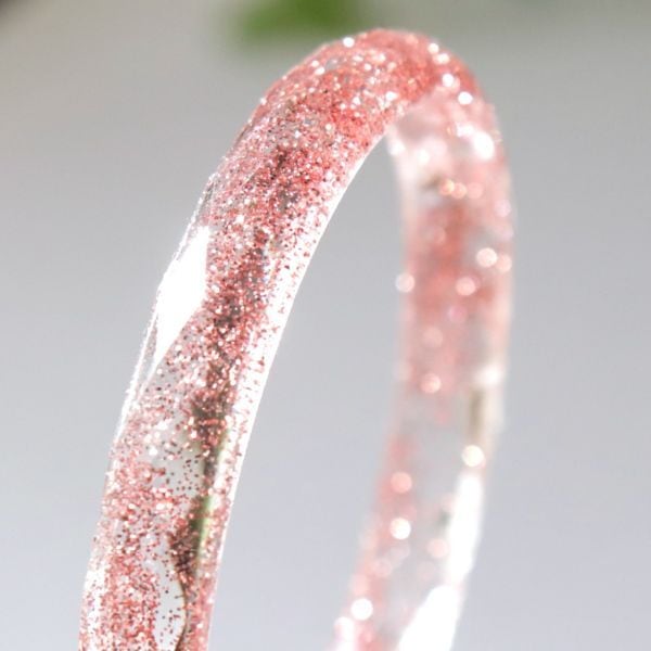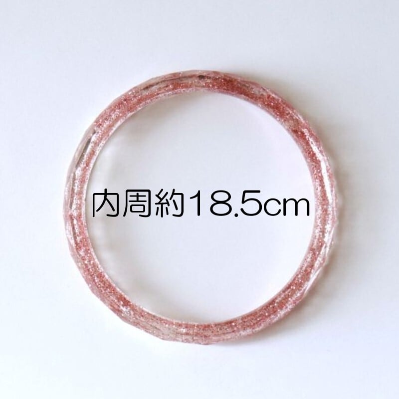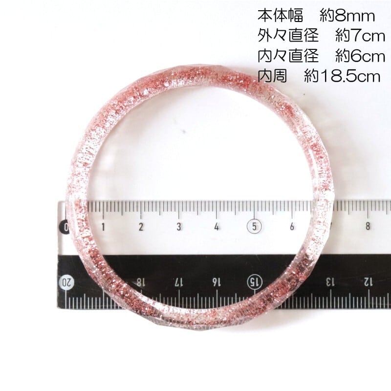 透明感のあるクリアなバングルに、ピングゴールドのラメをランダムに散りばめています。